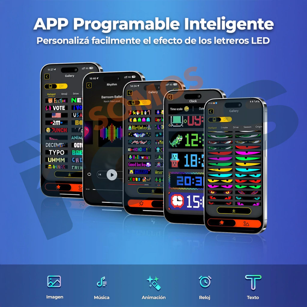 - Control inteligente desde tu smartphone: Configura textos, animaciones y efectos desde una App compatible con iOS y Android.